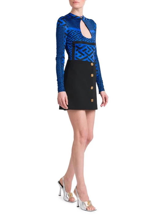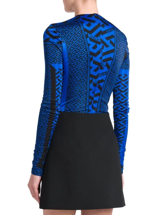 Evoking an early 2000s aesthetic, this collection showcases slinky silhouettes pierced with teardrop cut-outs and updated versions of signature Barocco and La Greca prints done in graphic colorways. This sleek bodysuit boasts La Greca print, adorned with a buttoned keyhole at the bodice.
