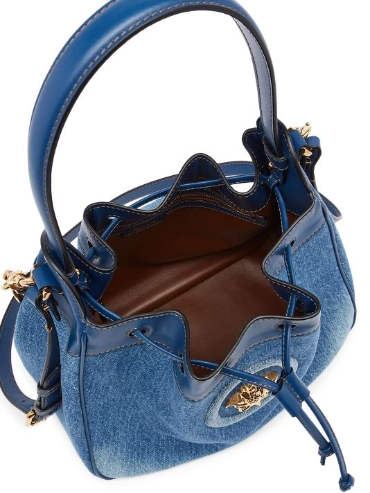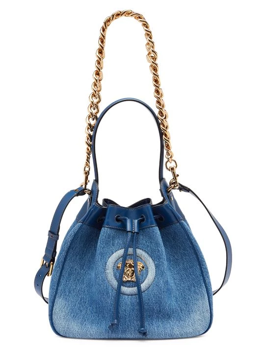 From the La Medusa Collection. Flaunting a slouched bucket silhouette, Versace’s bag boasts a denim construction. This Italian-made piece is highlighted with the instantly recognizable Medusa head.