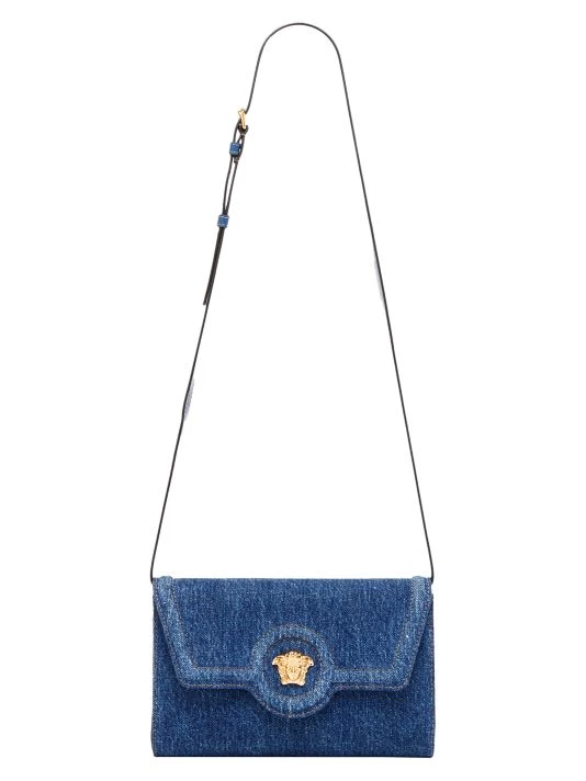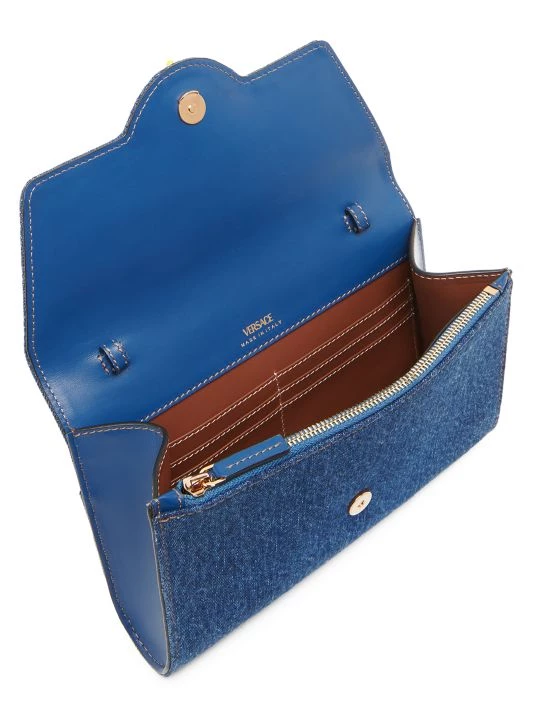 From the La Medusa Collection. Versace’s rectangular wallet is highlighted with the instantly recognizable Medusa plaque. Made in Italy, this denim piece is accompanied by a matching removable strap.