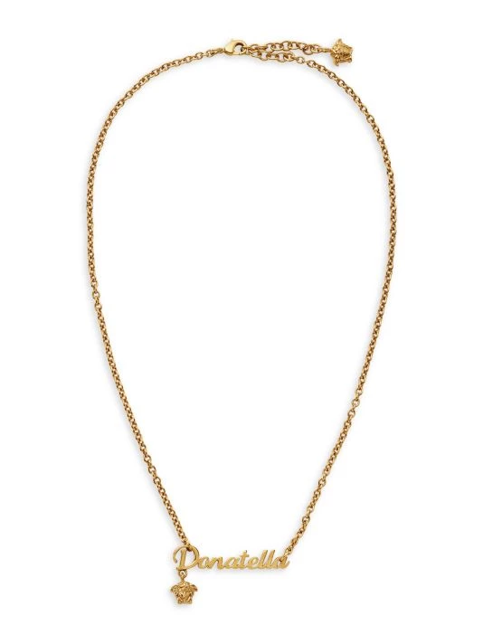 In playful fashion, this goldtone rolo chain nameplate necklace says `Donatella’ alongside a petite Medusa charm.