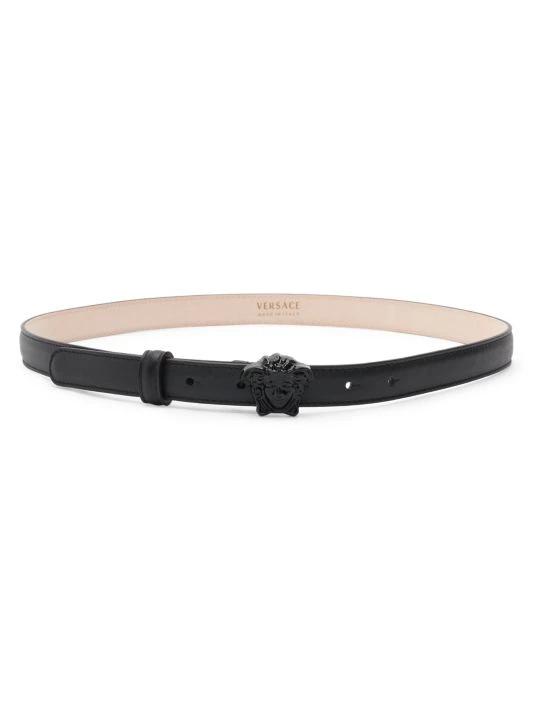 This skinny leather belt features a tonal 3D Medusa head buckle.