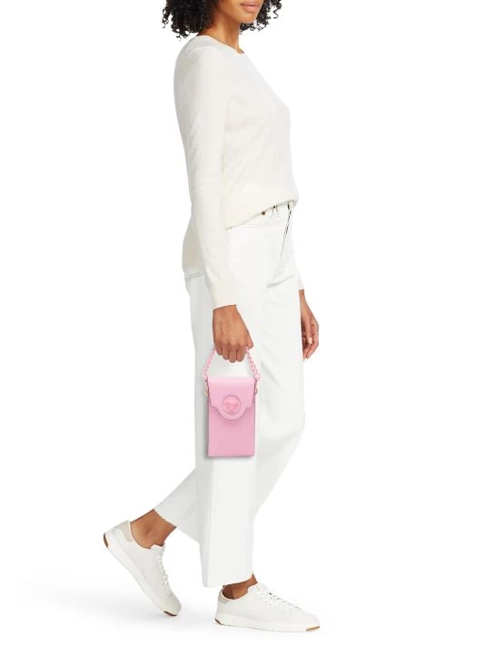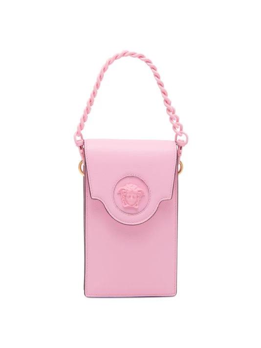 Rich Italian leather creates this phone case, decorated with Versace’s tonal Medusa emblem.A lightweight chain handle and leather strap accompanies the accessory for versatile placement.