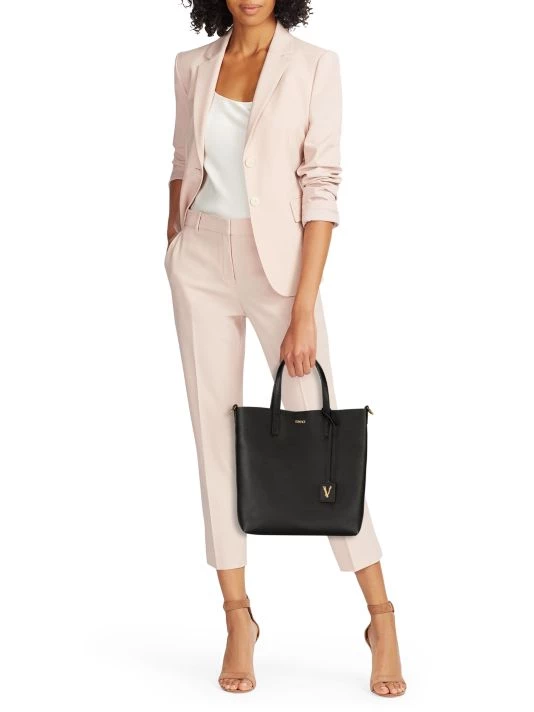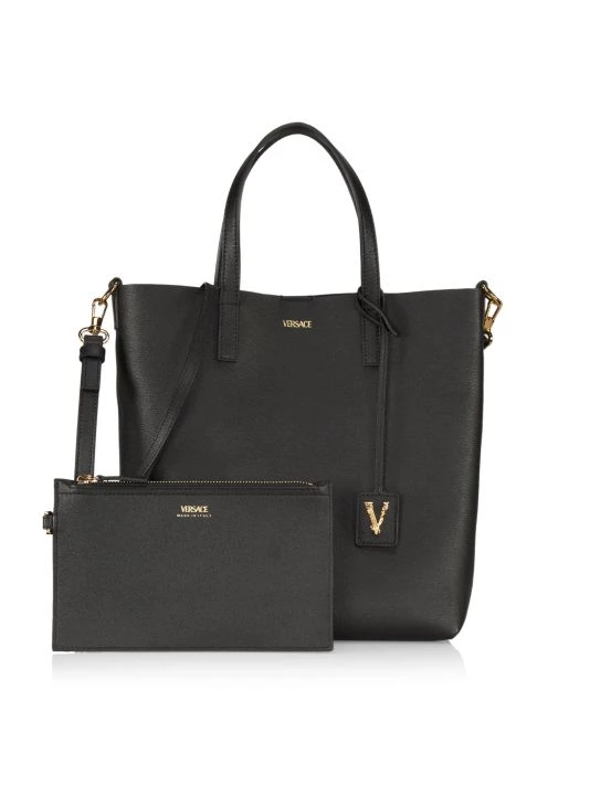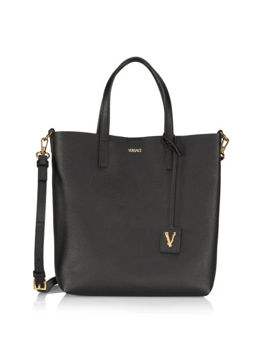 Crafted of textured leather, this tote features a removable logo plaque tag and an adjustable shoulder strap.
