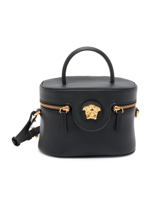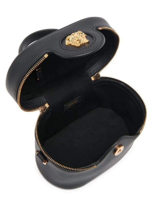 Finely grained Italian leather constructs this vanity case, decorated with Versace’s signature polished Medusa emblem. A removable leather strap accompanies the accessory for hands-free sophistication.