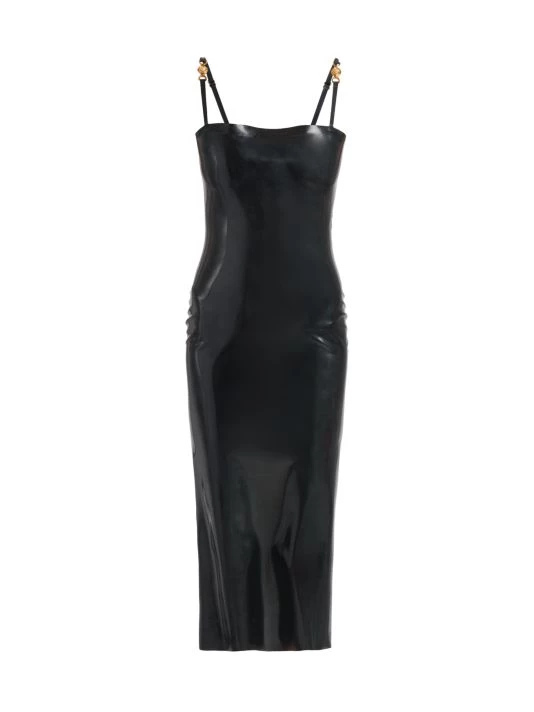 Evoking an early 2000s aesthetic, this collection showcases slinky silhouettes pierced with teardrop cut-outs and updated versions of signature Barocco and La Greca prints done in graphic colorways. This fitted latex midi-dress features thin shoulder straps adorned with goldtone Medusa medallions.