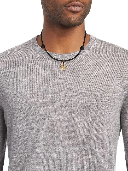 This Versace necklace features a leather chain with a goldtone metal Medusa head pendant.