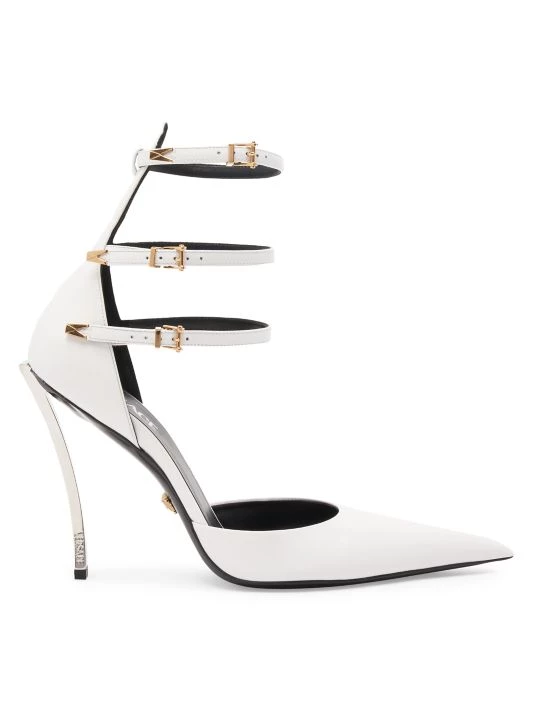 Versace’s pumps are anchored by a logo-etched metal heel. Enhanced with an elongated point toe, this Italian-made pair is fastened by three dainty buckled straps.