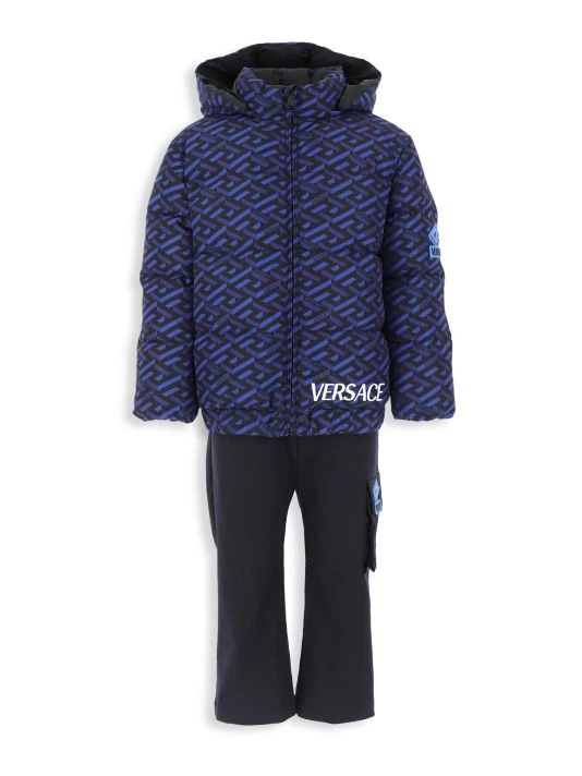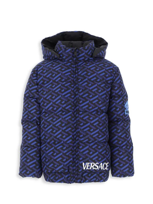 Versace introduces an updated La Greca print for its collection. Featuring the new motif in 3D, this puffer jacket features a detachable hood.