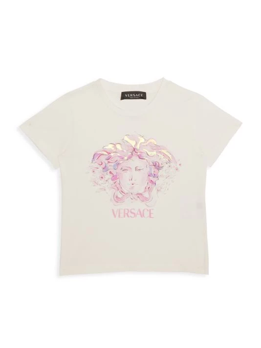 An iridescent effect adds flair to the signature logo design on the chest of Versace’s cotton T-shirt.