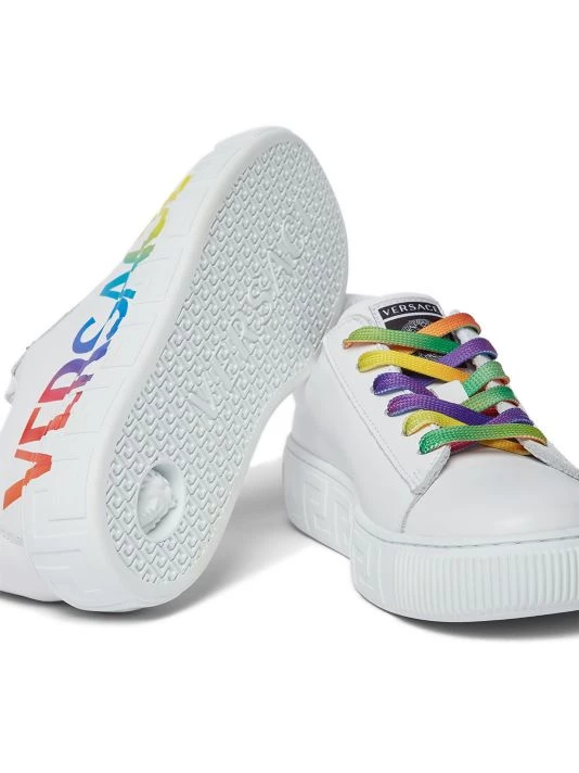 A rainbow-inspired multicolor logo adds flair to these leather lace-up sneakers with rainbow shoelaces.
