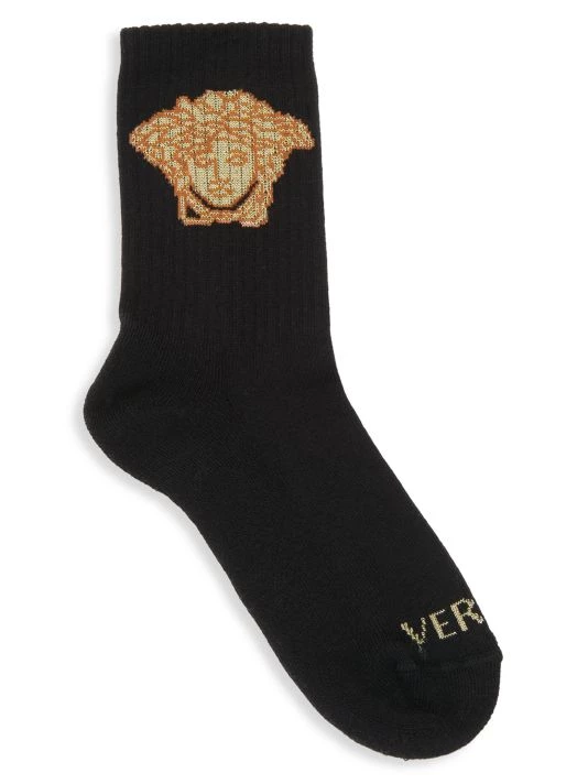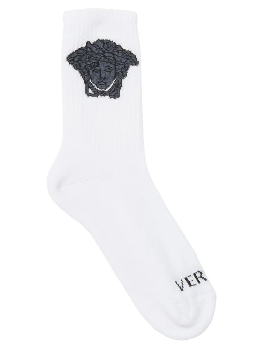 These mid-calf athletic socks by Versace are adorned with signature Medusa head motifs.