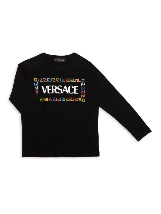 A colorful Greca design frames a classic embroidered logo on the chest of Versace’s casual T-shirt.