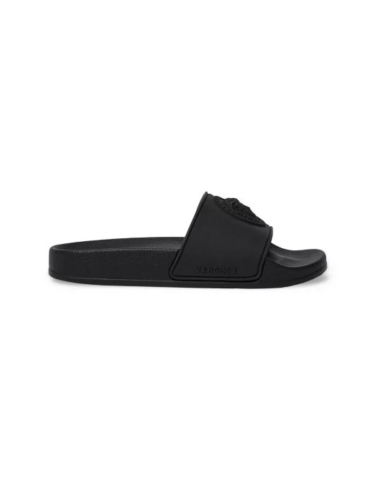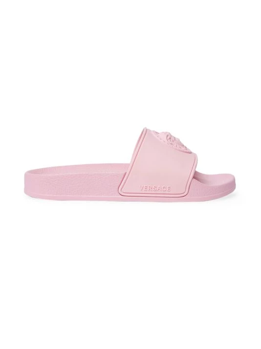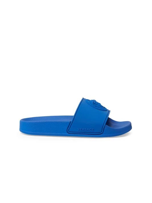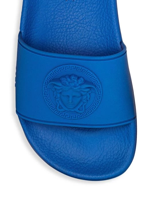 Embossed with a logo, these neon sandals make a decadent statement.