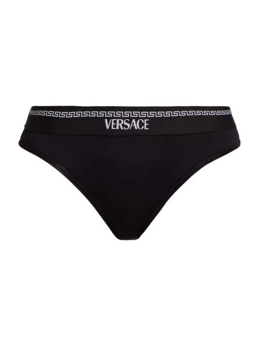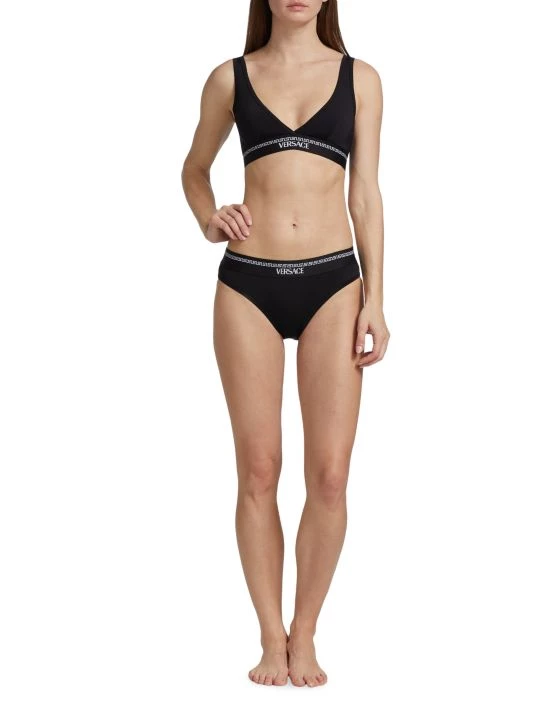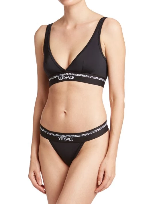 This bralette is designed in a v-shape with a brand monogram displayed along the waistband.