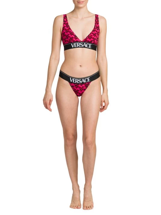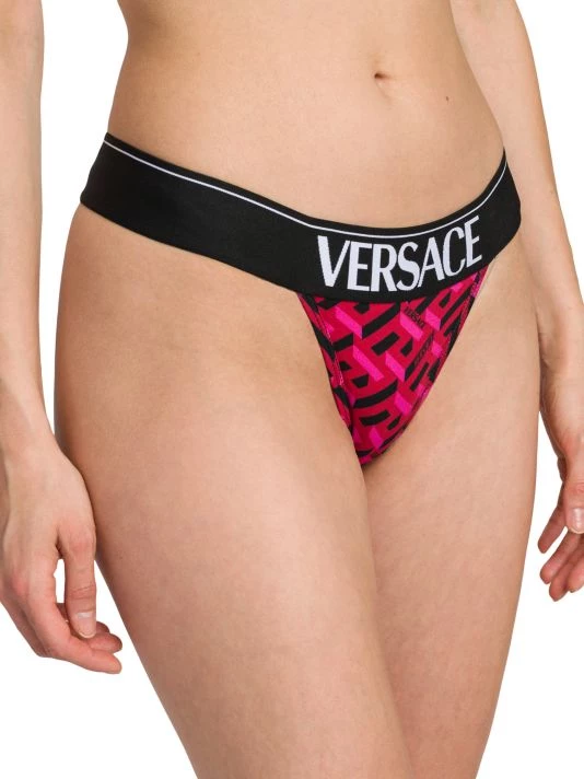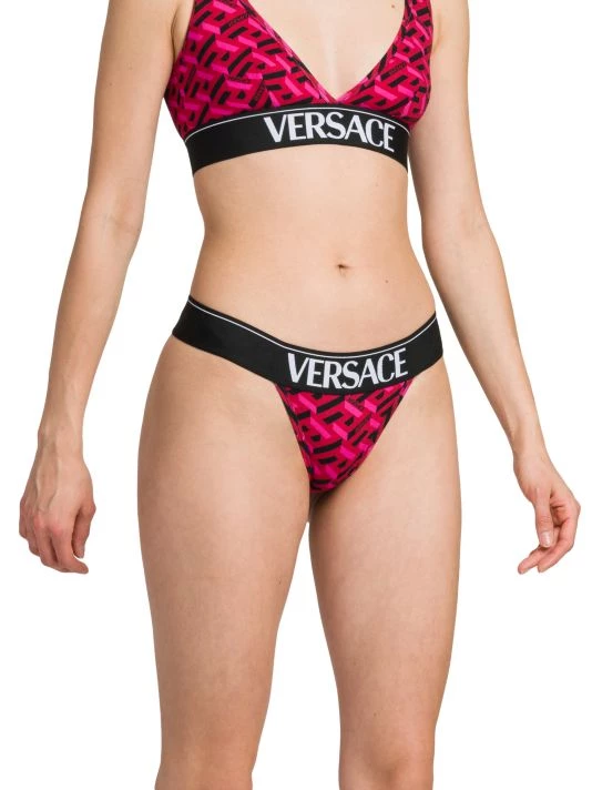 This Versace thong is crafted of stretch cotton jersey in the brand’s signature La Greca print. A wide elasticized waistband with logo lettering adds a sporty touch to the look.