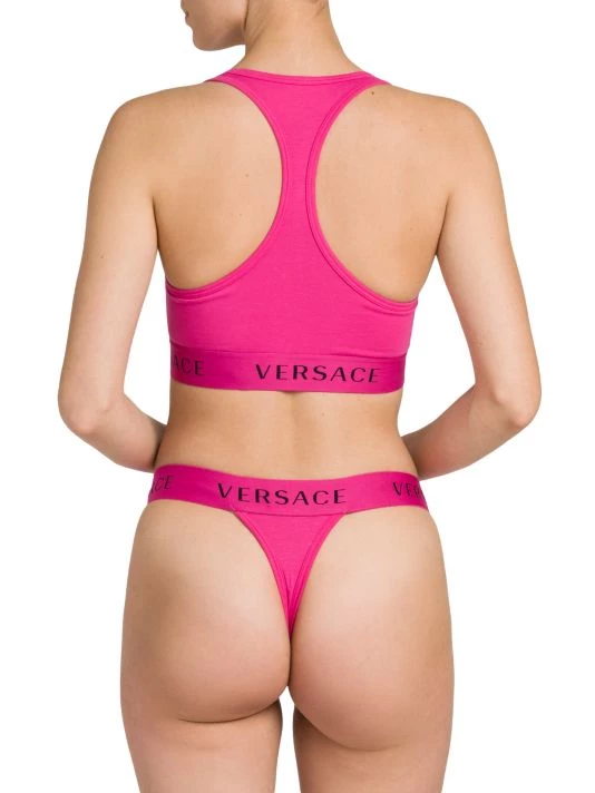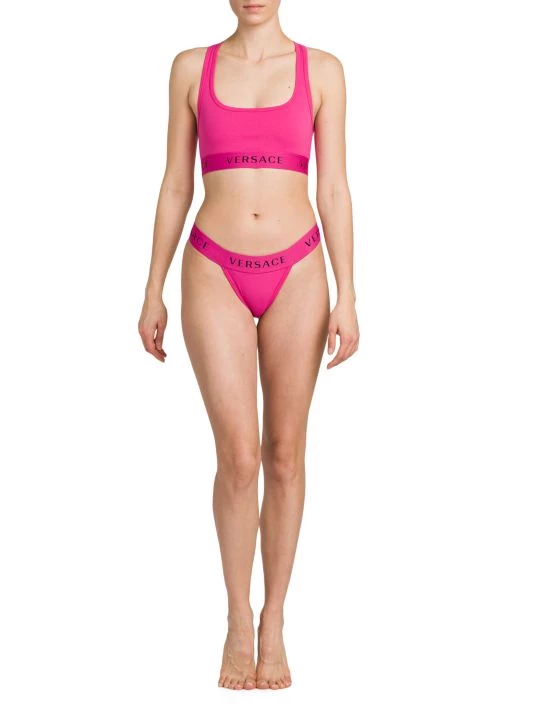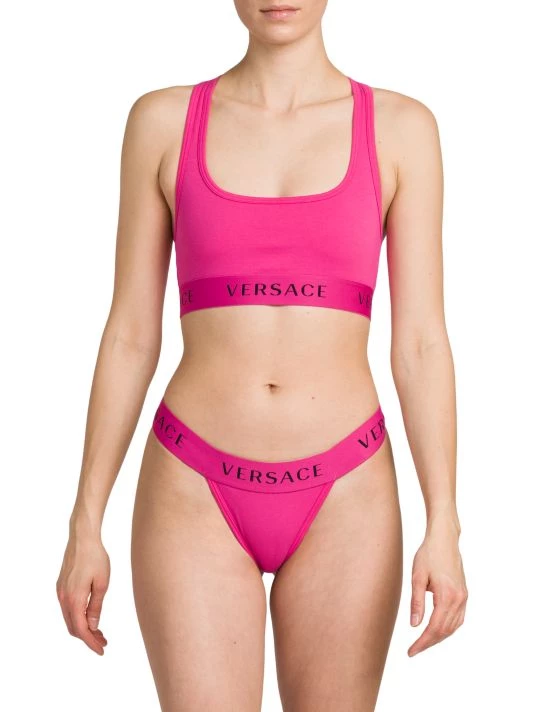 This Versace racerback bralette is crafted of soft stretch cotton in a racerback silhouette. A square neck and a sporty wide band with logo lettering define the look.