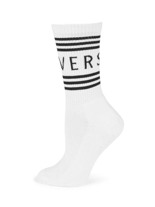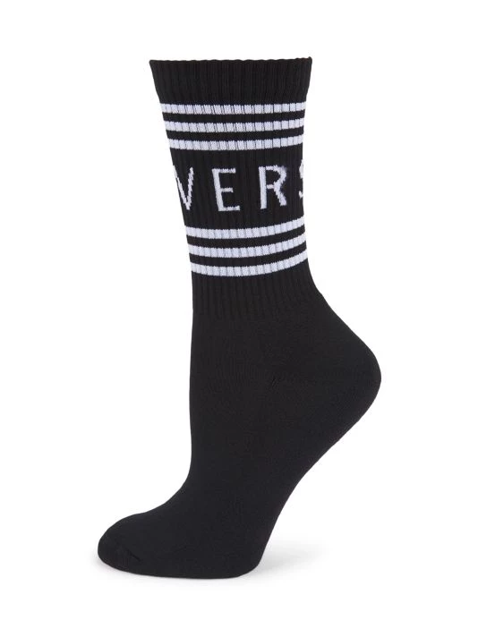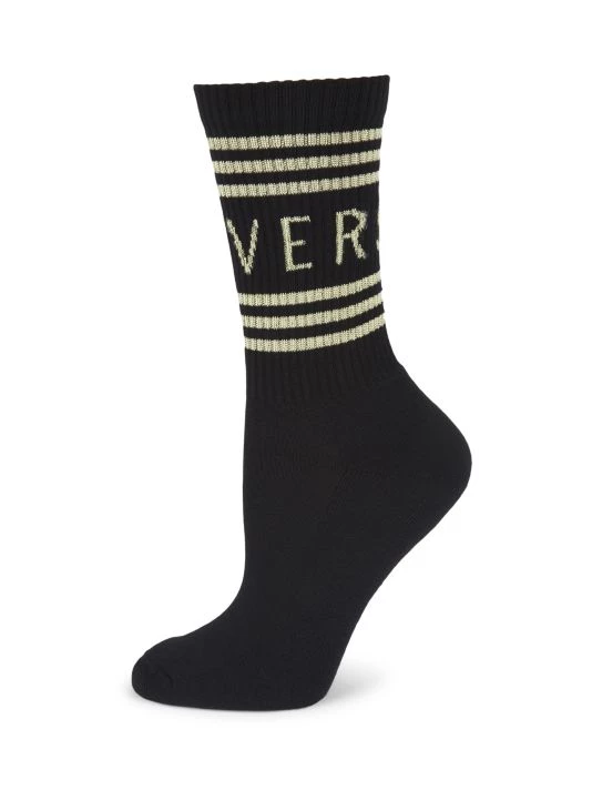 Lurex-knit logo in block lettering adorns these socks.