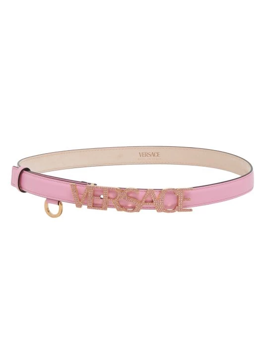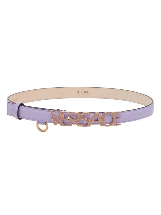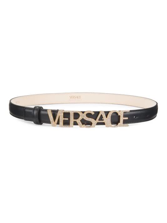 Versace logo hardware adorned with shimmering crystals highlights this smooth leather belt.