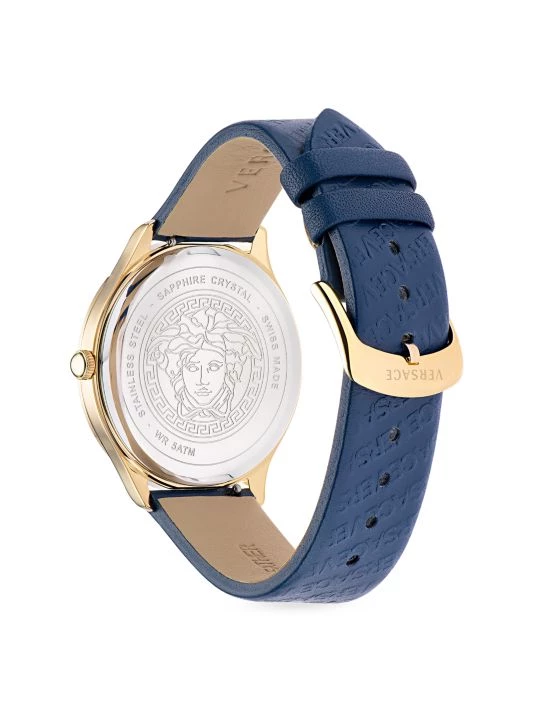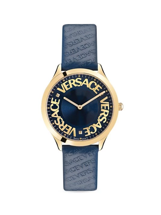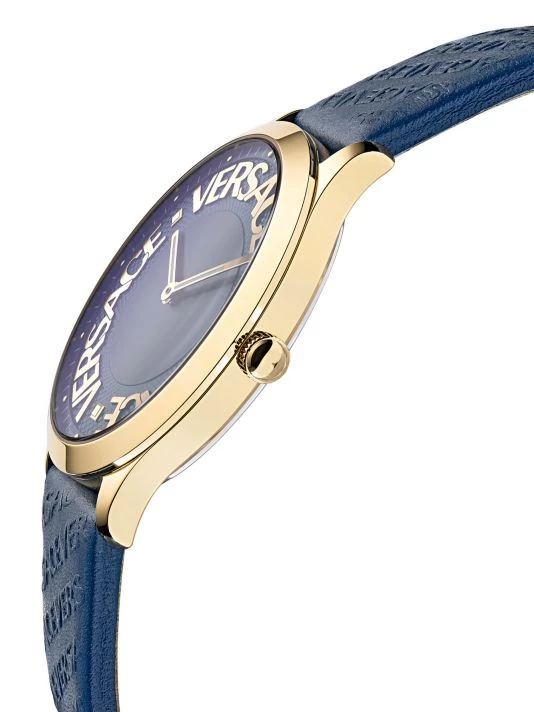 This slim 38mm case body is enriched with three versace letterings in metal and a unique leather strap with versace versace lettering embossed.