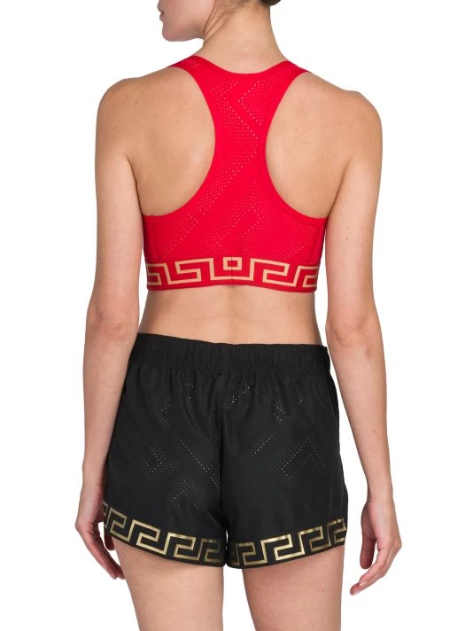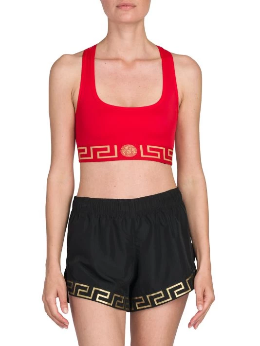 Versace’s chic sports bra showcases the label’s signature Greca pattern and Medusa head motif at the underband.