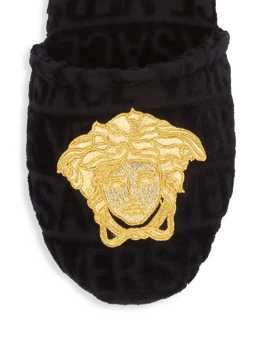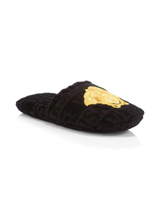 Ultra-comfortable cotton slippers embroidered with Versace’s iconic goldtone Medusa head motif and textural logo lettering.
