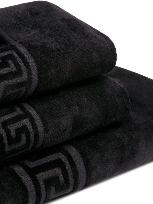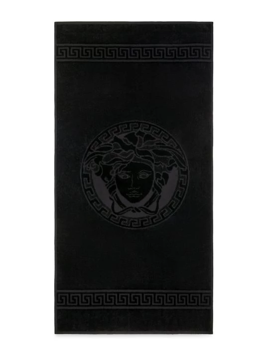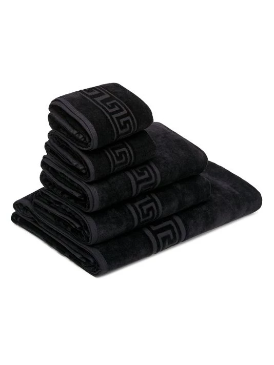 Five-piece set of bath towels with the Medusa head decoration. Cotton. Machine wash. Made in Italy.