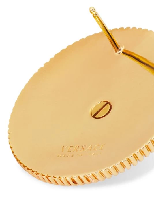 Versace’s goldtone disc earrings are embossed with the label’s iconic Medusa-head motif. Detailed with a ridged border, this striking pair secures with a post back.