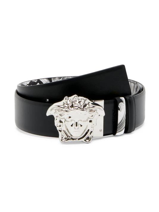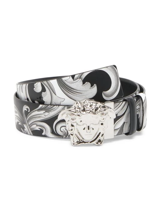 True to their provocative nature, Versace unveils a compelling collection that embraces the multiplicity, progression, and diversity for a new generation. With clean lines, fluid shapes, and vivid colors, this 2.0 menswear launch features unstructured blazers, voluminous trousers and watercolor renditions of traditional checks, pinstripes, and archival prints. This leather belt in the signature Barocco print features a silvertone Medusa head logo buckle.