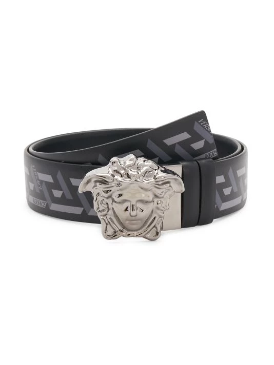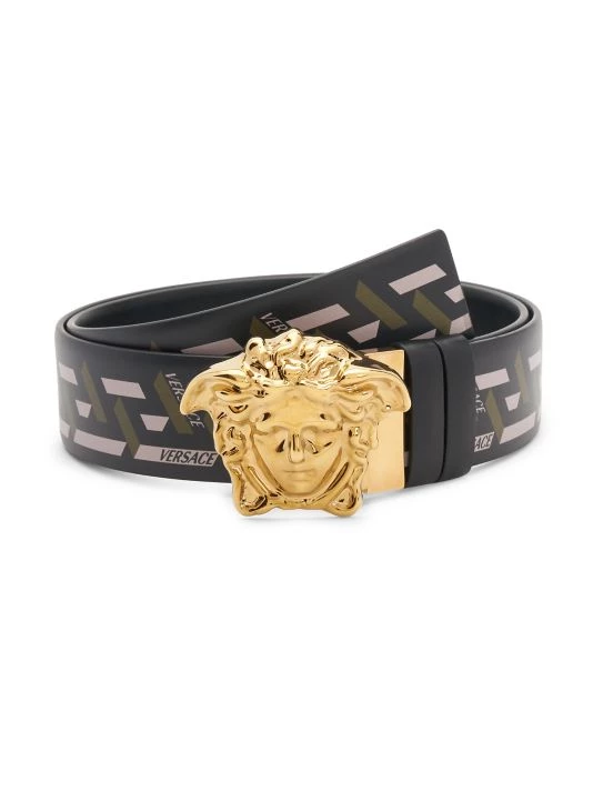 An iconic Medusa buckle centers this printed logo belt.