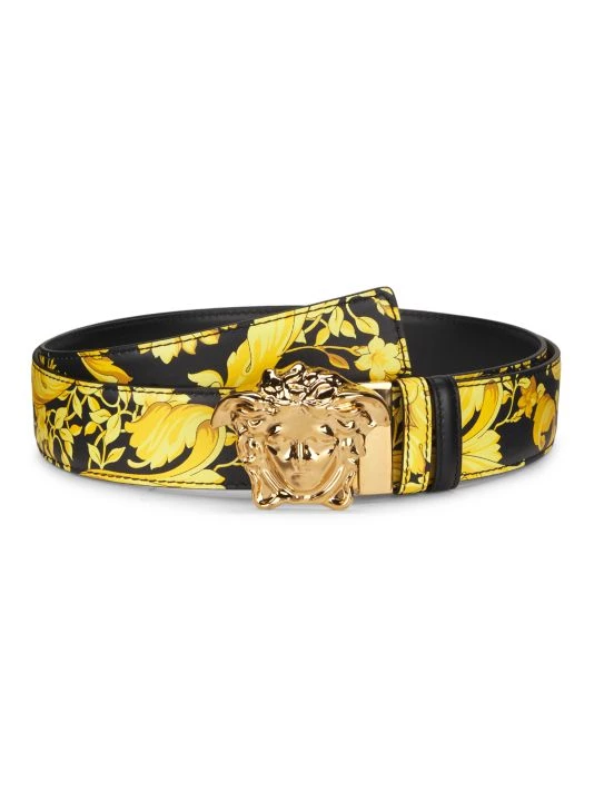 Signature Versace baroque print details the face of this reversible leather belt with goldtone Medusa buckle.