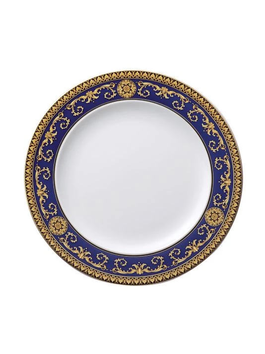 Porcelain dinner plate with iconic Medusa logo and scroll print.
