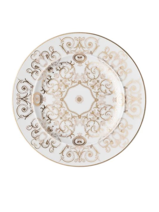 Exquisitely-detailed to charm your dining table setting, this captivating goldtone plate features vintage inspired scroll motifs complemented by shiny rims.