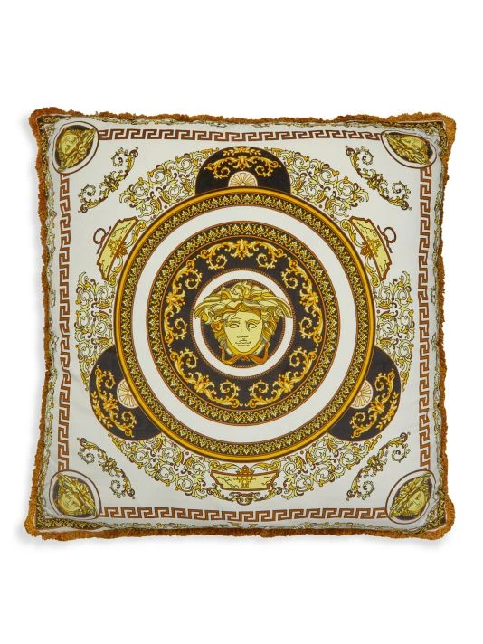 From the Medusa Gala Collection. This square pillow features iconic head of Medusa print on one side and a stunning Baroque motif on the reverse. It is finished with fringe on all seams.