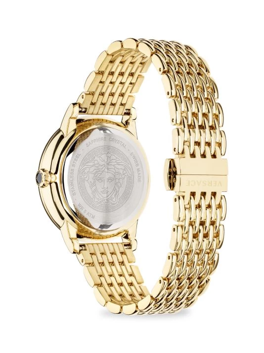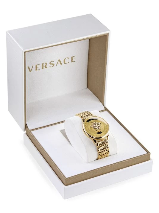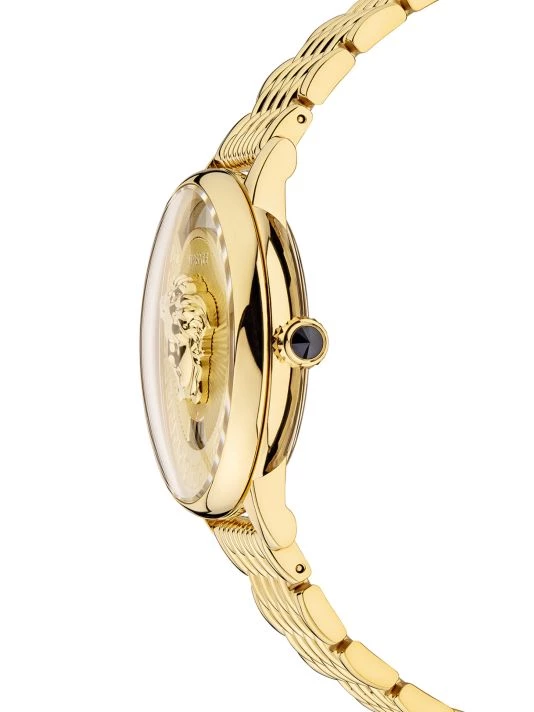 From the Medusa Icon Collection. The Medusa Icon is an iconic timepiece whose beauty is given by the use of the Medusa head that stands with elegance in the center. A contemporary and iconic design code come together to give the watch a distinctive look bringing to light the splendor of the Versace icon, the Medusa. The disc covers the dial where hours are readable at 12h and minutes at 6h.