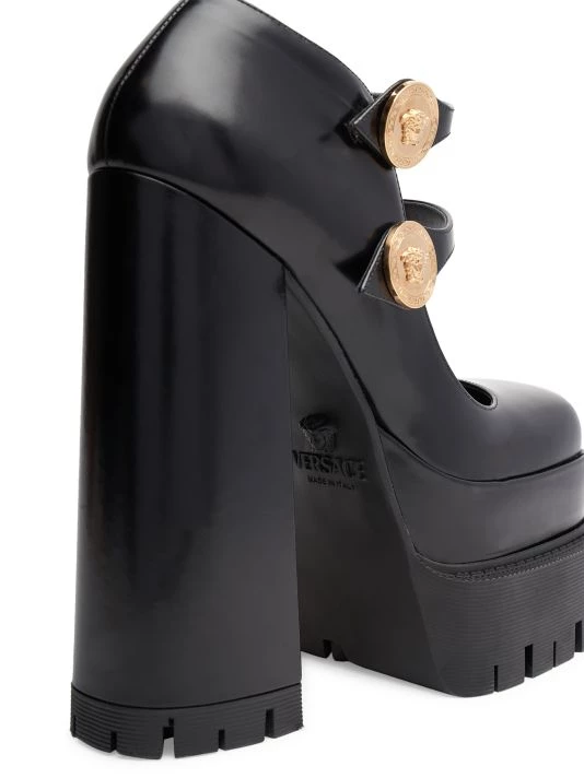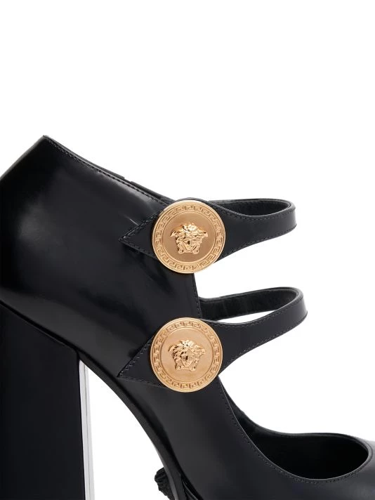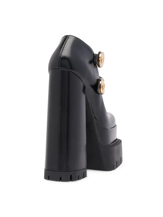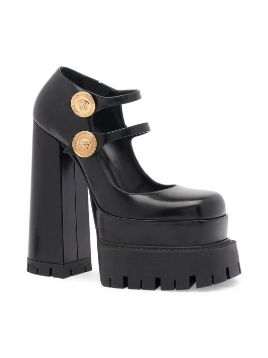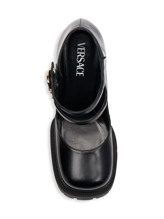 Versace’s pumps are anchored by a double platform and striking block heel. Made in Italy of rich leather, this bold pair is detailed with a Medusa head plaque at the vamp straps.