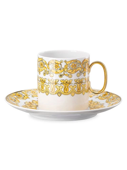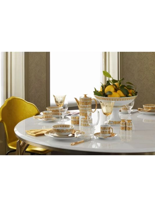 From the Medusa Rhapsody Collection. A rhapsody of color and detail. One with the ready to wear collection, the dinnerware and clothing draw inspiration from each other resulting in a modern, yet intrinsically Versace. The Medusa and Baroque flowers are painted in opulent golden shades, while key items feature the Versace logo label.