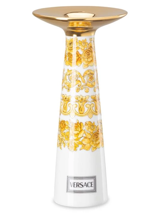 Drawing inspiration from ready-to-wear collection results in a remarkably modern Versace collection. Medusa Rhapsody features opulent goldtone shades. Candle holder features the Versace 90s Vintage logo label.