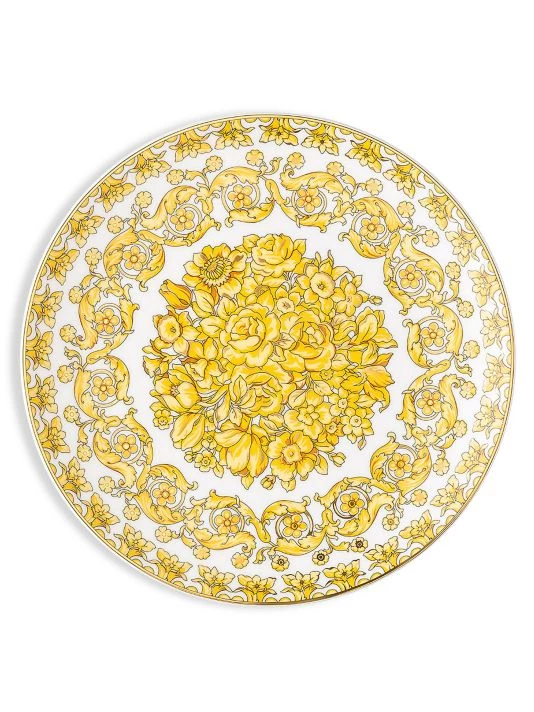 From the Medusa Rhapsody Collection. A rhapsody of color and detail. One with the ready to wear collection, the dinnerware and clothing draw inspiration from each other resulting in a modern, yet intrinsically Versace. The Medusa and Baroque flowers are painted in opulent golden shades, while key items feature the Versace logo label.
