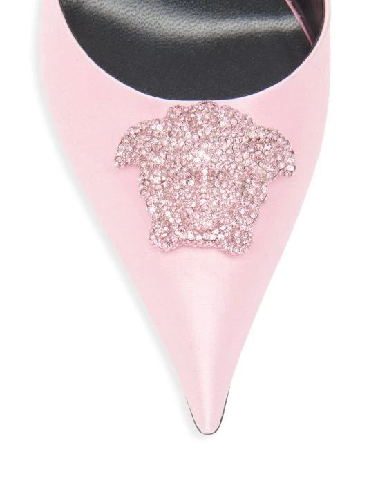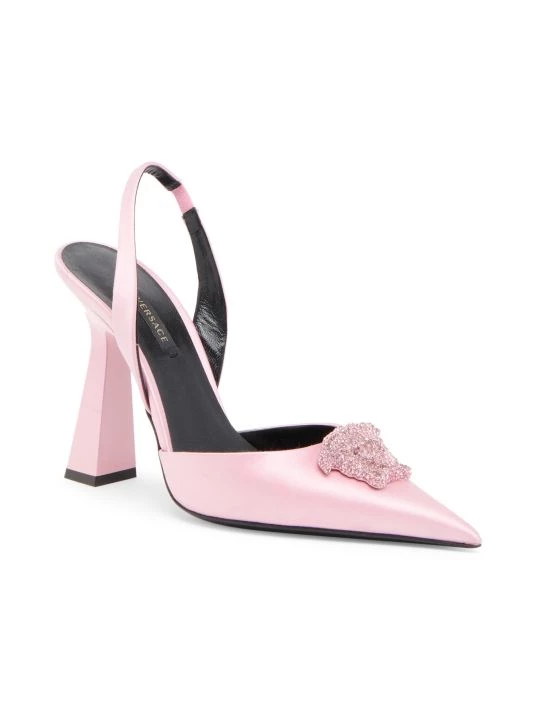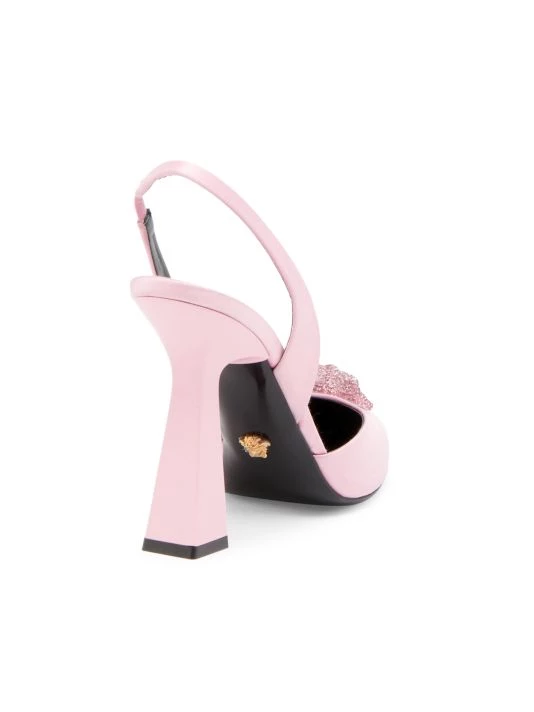 Flaunting an angled heel and refined point toe, these slingback pumps are decorated with a crystal embellished Medusa emblem for a touch of glamour.