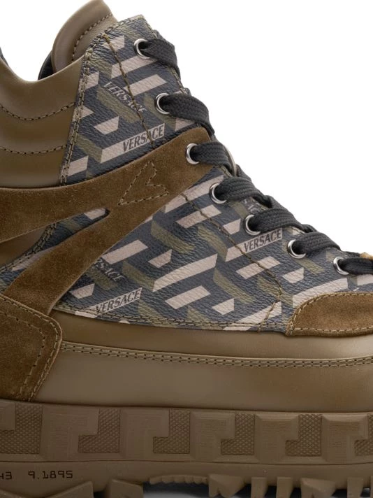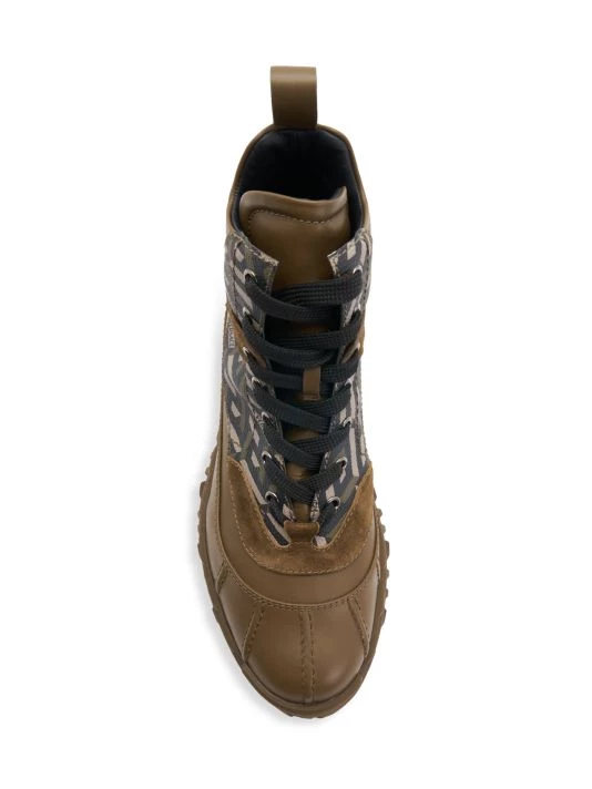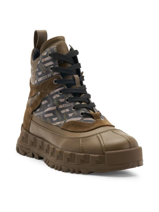 Elevated with greca printed and suede panels, these hiking-inspired boots feature an embossed rugged sole.