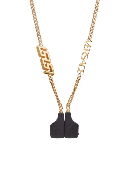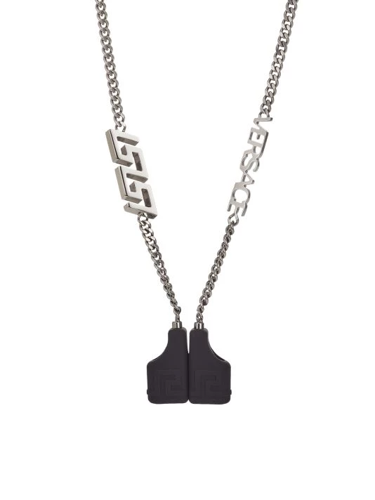 This metal necklace features a branded silicone pendant and branded details in the chain.