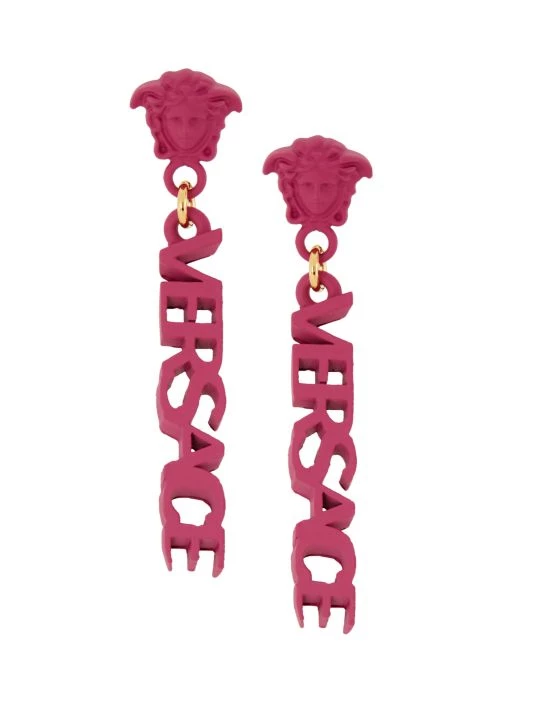 Crafted of purple metal, Versace’s earrings each feature a Medusa-head stud joined to a logo drop.
