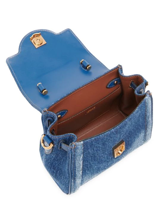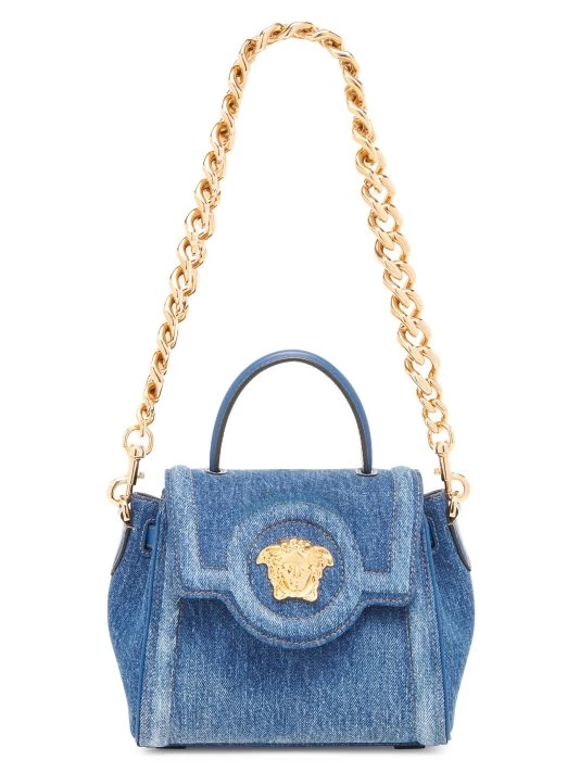 From the La Medusa Collection. Highlighted with the instantly recognizable Medusa head plaque, Versace’s mini bag boasts a denim construction. This Italian-made piece is accompanied by a chunky chain strap.