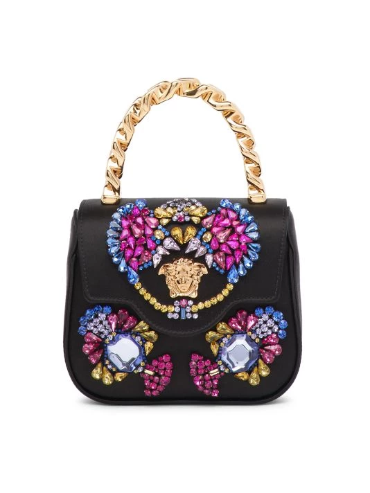 From the La Medusa Collection. Punctuated with the instantly recognizable Medusa head plaque, Versace’s mini bag is decorated in gleaming crystal embellishments. This Italian-made piece is finished with a stiff-chain top handle.