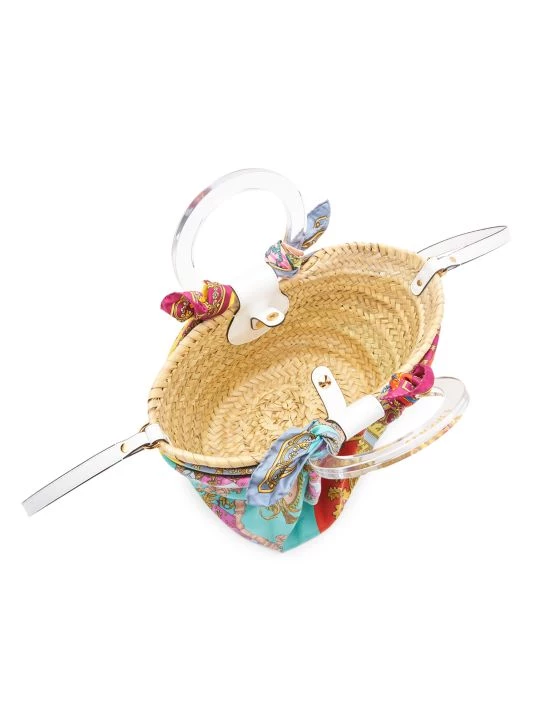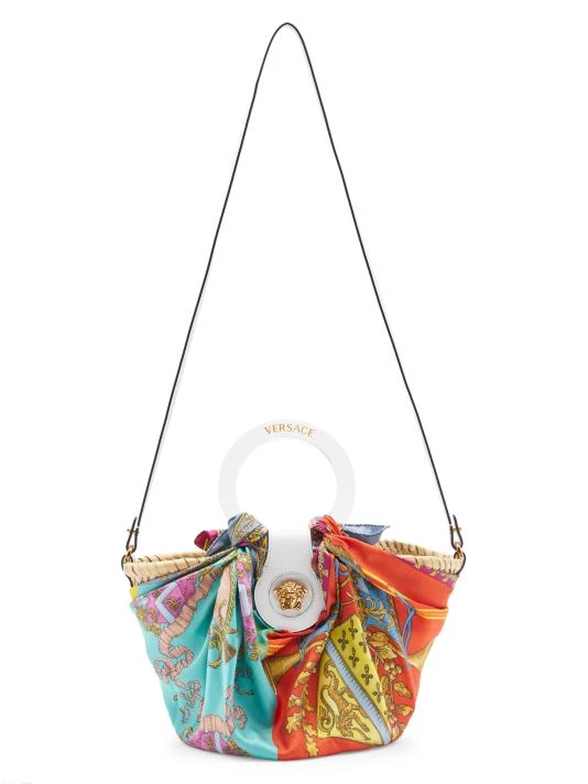 Made in Italy of woven raffia, Versace’s tote is wrapped in a vibrant mixed Barocco print scarf adorned with the signature Medusa head plaque. This piece is finished with rich leather straps and round acrylic handles with an understated metallic logo.