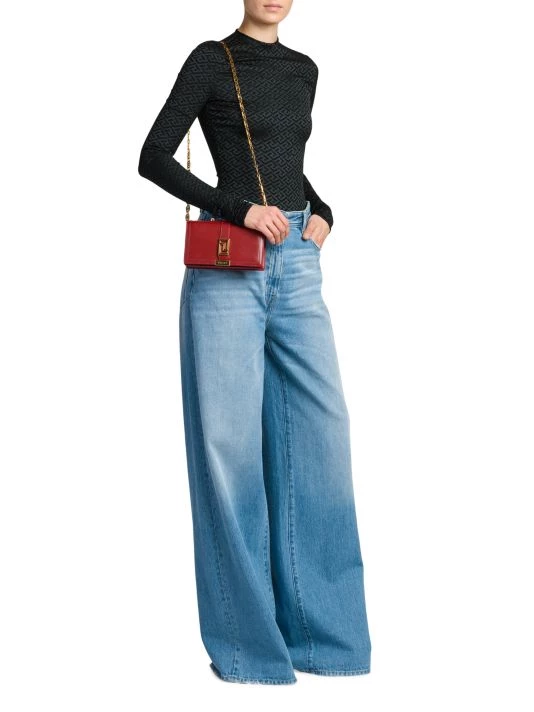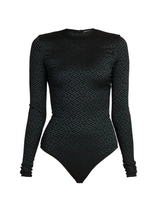Showcasing the label’s iconic monogram, Versace’s jersey bodysuit is styled with a mockneck and long sleeves.