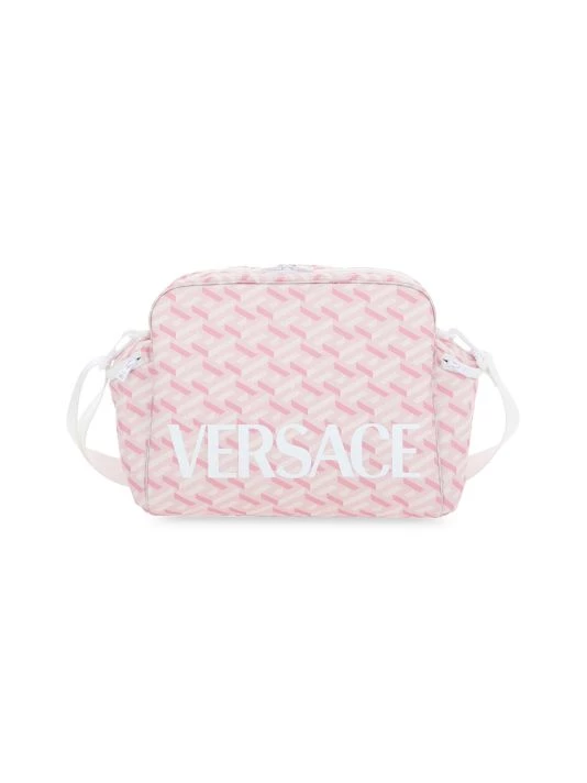 This multifunctional shoulder bag boasts a pastel Versace monogram print and an enlarged text logo across the front.