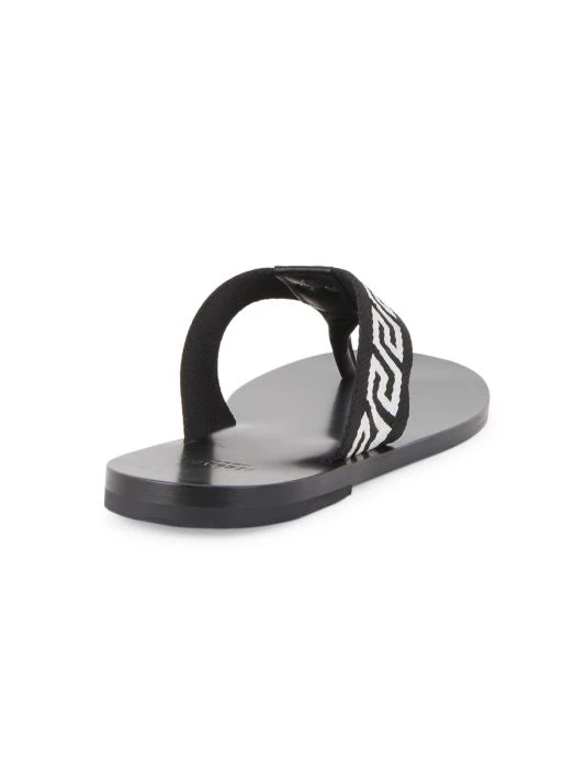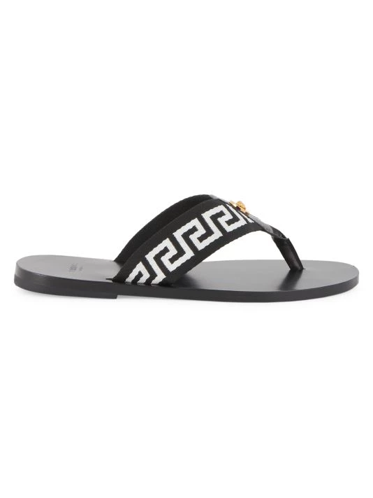 Sleek leather thong sandals with signature Greek key print web strap and Medusa medallion.