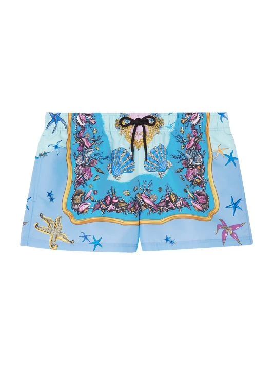 These Versace swim boxers are crafted of polyester. Featuring a drawstring elastic waistband, this piece is styled with a sea life print.