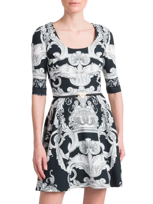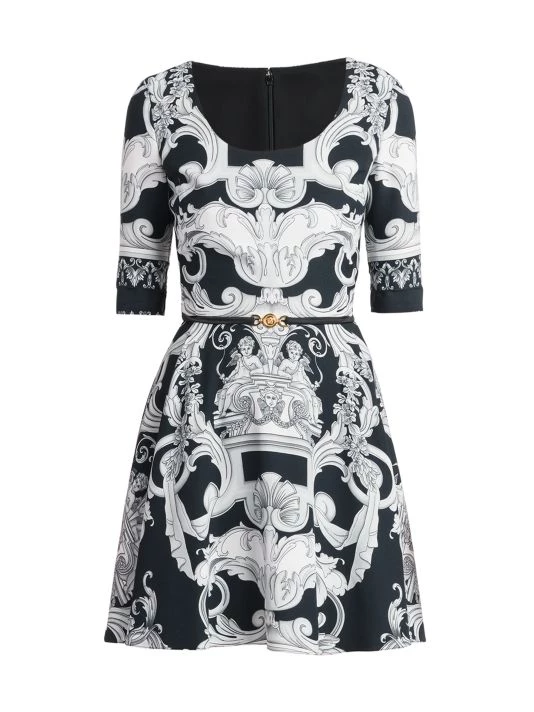 Evoking an early 2000s aesthetic, this collection showcases slinky silhouettes pierced with teardrop cut-outs and updated versions of signature Barocco and La Greca prints done in graphic colorways. This classic fit-and-flare minidress features an oversized Barocco print and matching belt.